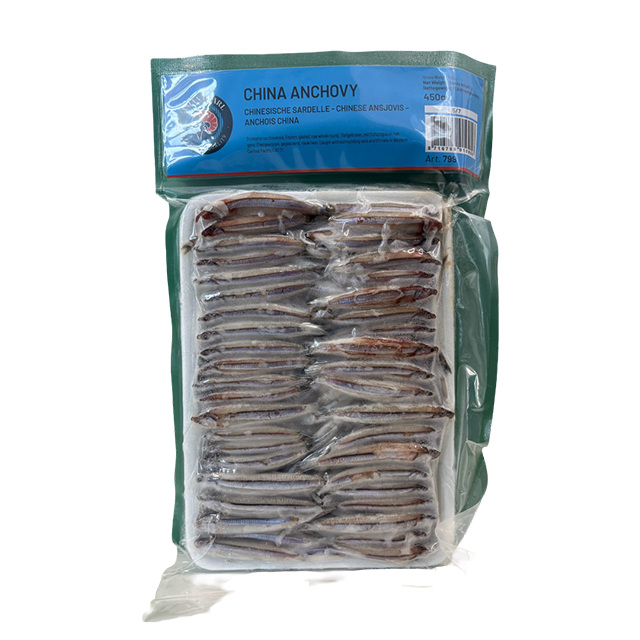 This West Pacific fish can grow to 3.5 inches but the photo specimen was 2-3/4 inches. A tray of 70 weighed 14 ounces, 0.2 ounces each, or 80 to the pound. They are found mainly in the South China Sea, from Borneo north to Taiwan and around the Philippines, and west around the Malay Peninsula. Color stripes (wide silver with narrow dark above) is like the Blue Anchovy, but this one is larger with a bigger eye and different shaped face.