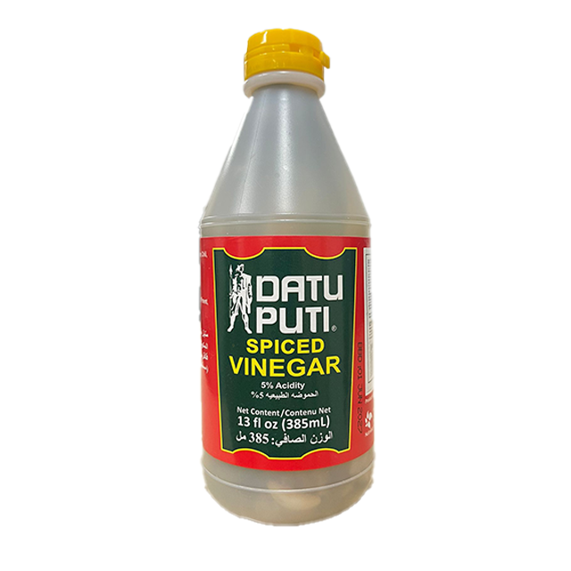 Datu Puti Spiced Vinegar is a 385ml bottle of Filipino vinegar made from a base of distilled or cane vinegar, flavored with onion, garlic, and chili peppers to create a tangy and spicy taste. It is a versatile condiment used in dipping sauces, marinades, and cooking for dishes like fried meats, seafood, and stir-fries. It is halal, gluten-free, and dairy-free.