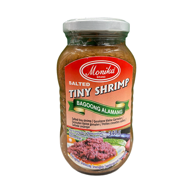 Monika Salted Tiny Shrimp (Bagoong Alamang) is a popular Filipino, 340g bottled fermented shrimp paste, often used for its pungent, salty, and savory umami flavor in dishes like Kare-Kare, stir-fries, or as a dip for green mangoes. It consists of 60% shrimp fry, salt, water, sugar, and vinegar.