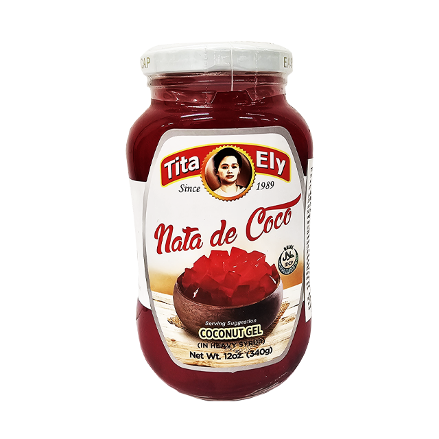 A chewy, jelly-like translucent food produced by the fermentation of coconut water. Made from fresh coconut gel that was cooked to attain smooth and tender gel. It contributes to a healthy diet because it contains low calories and good fiber. Preserved and packed with extra heavy syrup.